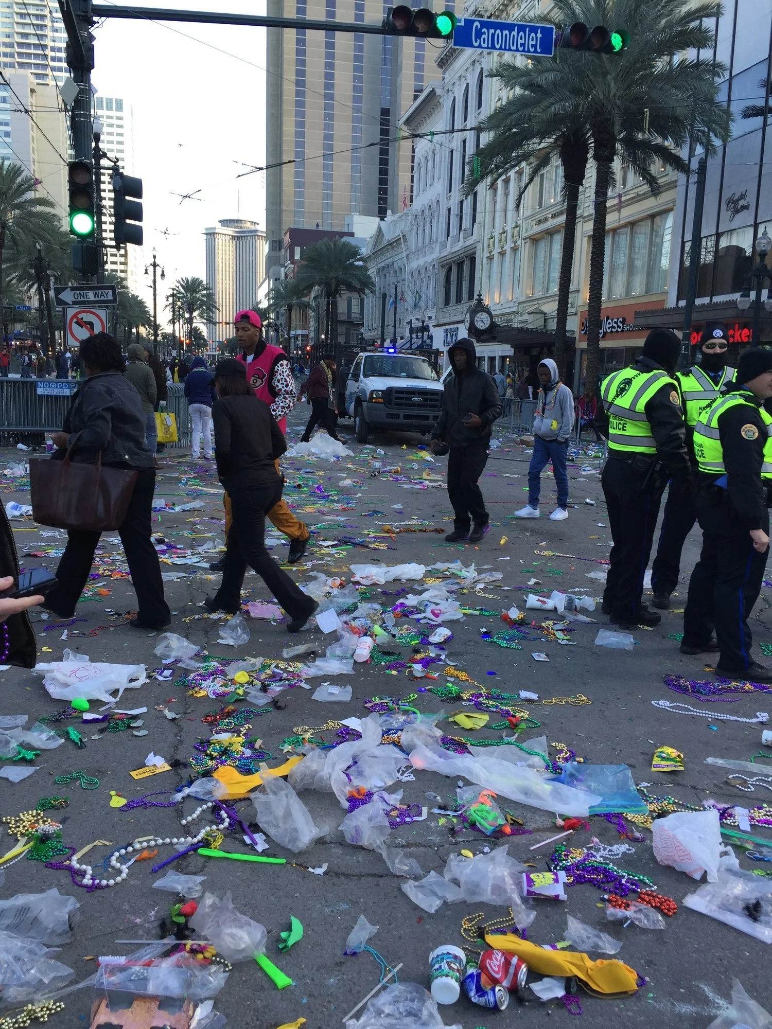 I saw parade watchers on balconies attempt to throw beads across the four-lane street to the opposite balconies. I saw them succeed in the endeavor, too. I saw people on top of the parade floats, dressed in feathers that extended an easy six feet over their heads. I saw a parade marcher give a news interview as he drank a Bud Light. I saw float riders toss beads to the crowd with one hand while drinking from a jug in the other. I saw the absolute mess on Canal Street at noon on Tuesday as the parade passed through. I saw the city of New Orleans take to the cleanup effort as if it were no big deal at all.