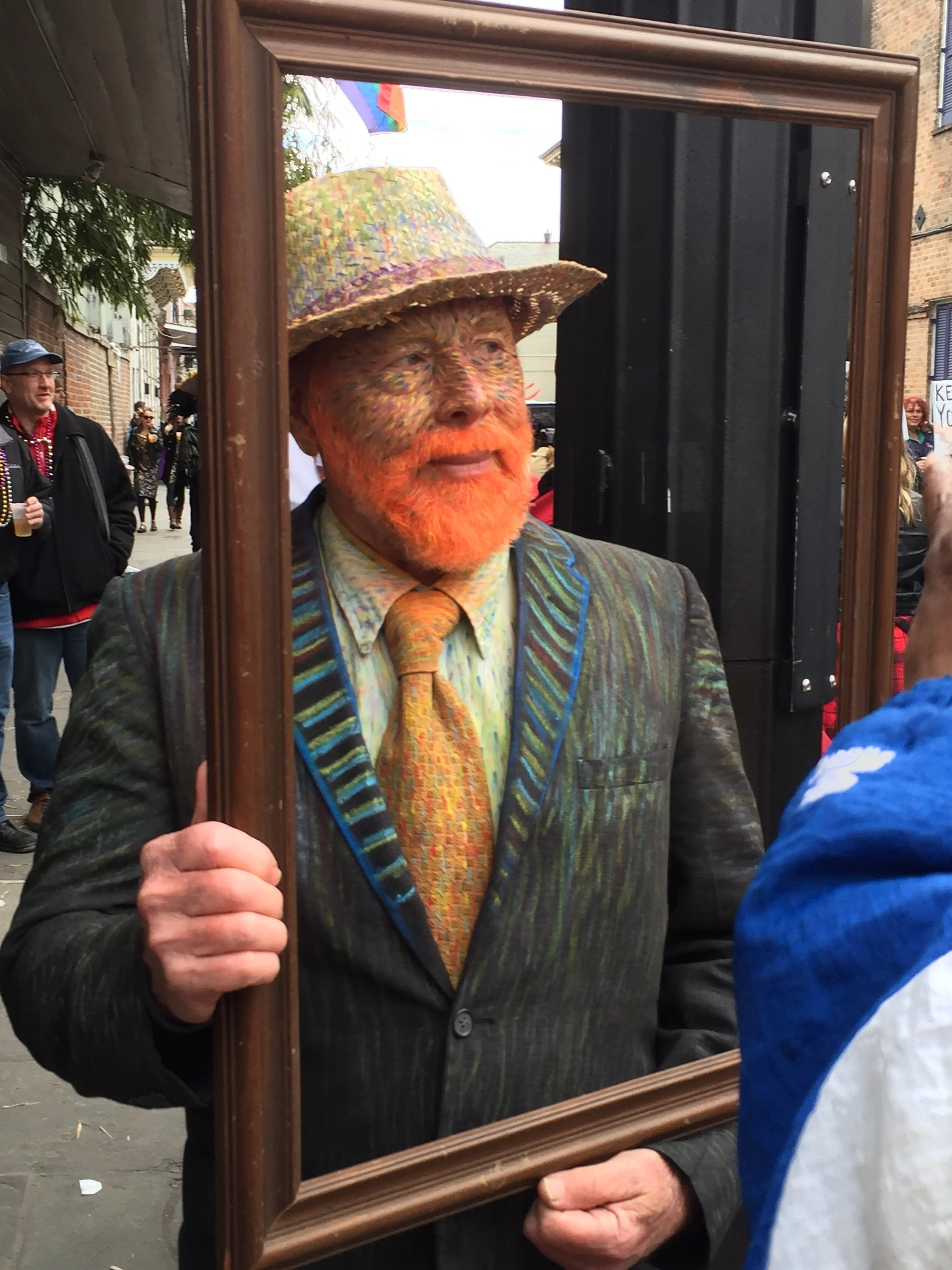 By day, you could traverse the Bourbon Street crowds easily, and there was music everywhere—especially live music on the side streets. At night, the movement was much slower, and thus, more chatty, especially in areas with balconies above Bourbon because partiers tossed (on Sunday) and threw (Monday’s Lundi Gras) and outright rained down cases (Tuesday’s Mardi Gras) of beads onto all of us in the street below. (There’s a misconception that the only way you get beads is to flash someone. Not true: Beads are freely given, thrown, and traded.) Each day and night, you literally skated on the beads that had fallen on Bourbon Street. (And Bourbon Street was cleaned every night.) Then on Tuesday, you waded around heaps of them so tall that you pushed the mounds to see make sure there weren’t people underneath them.